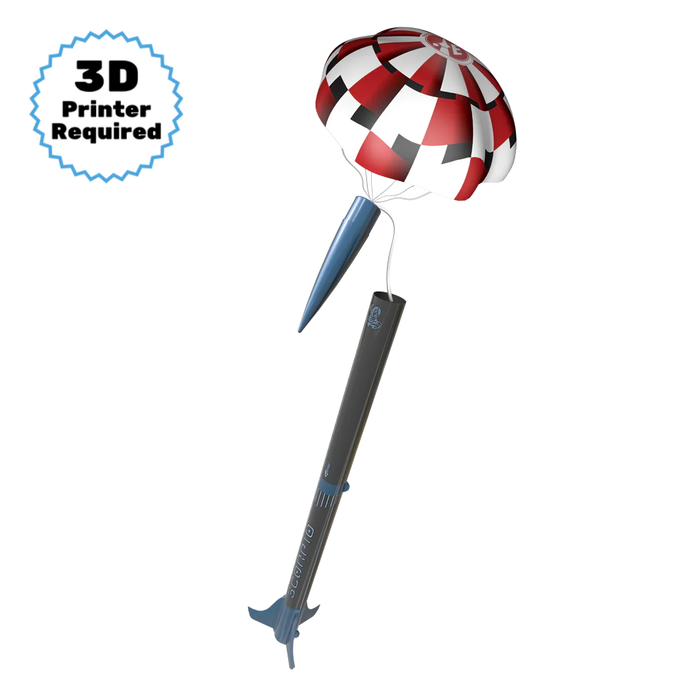 In addition to the downloadable 3D print files, the Scorpio 3D kit includes all the physical components you need to complete your build: a durable body tube, engine mount tube, aramid cord, shock cord, a 24-inch ripstop parachute for recovery, and a set of water slide decals for finishing. These components pair with your printed parts to create a high-performance, fully functional model rocket ready for flight.